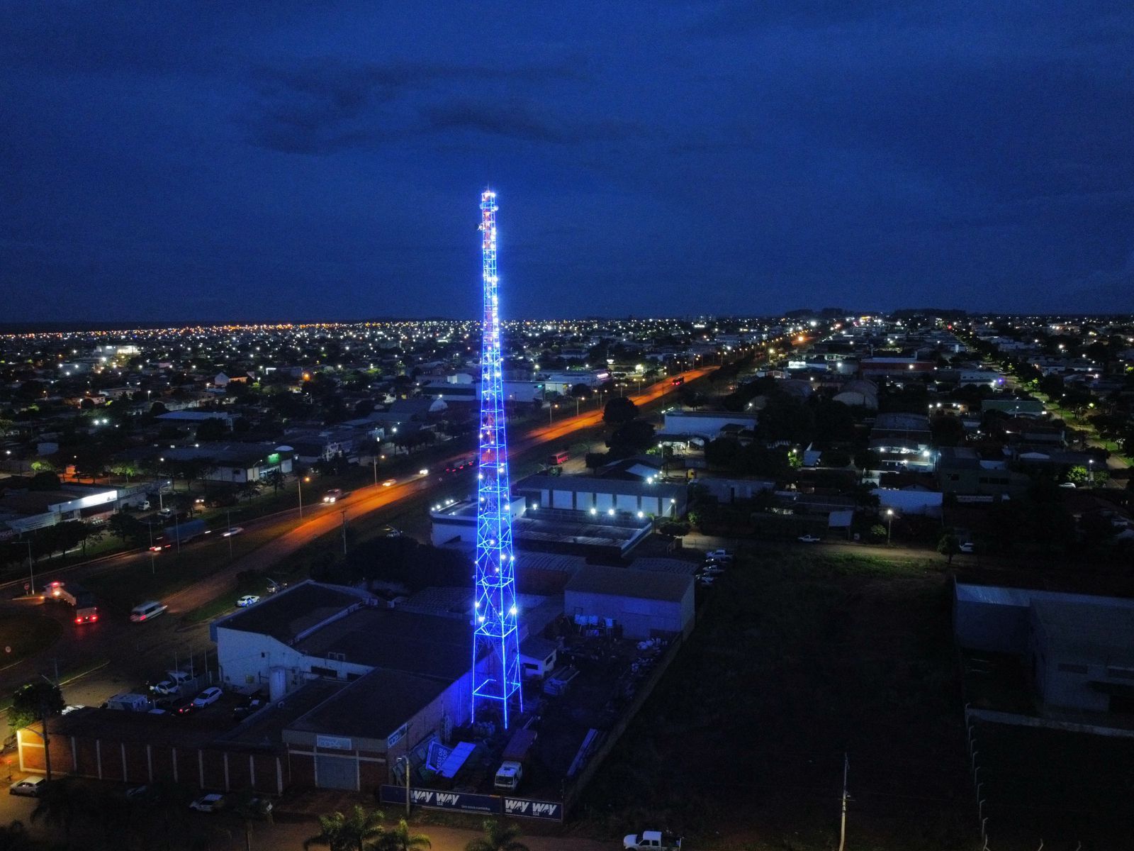A Way-306 inaugurou na noite desta segunda-feira (4/12) sua Árvore de Natal, localizada na sede da Concessionária, em frente ao km 117 da MS-306. Com 60 metros de altura, a torre de radiocomunicação ganhou iluminação especial de Natal, com mais de 1.000 metros de fitas de LED azul, cor da logomarca da Concessionária, além de 300 strobos, uma luz estroboscópica que produz flashes de luz.
