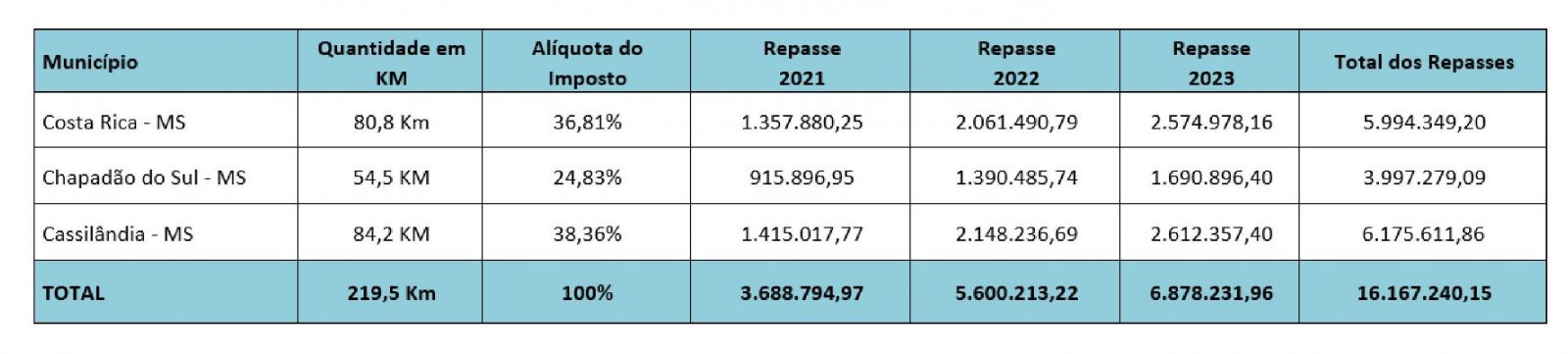 Com base nessas porcentagens, desde o início da arrecadação até 31 de dezembro de 2023 Costa Rica recebeu R$ 5.994.349,20 de repasse, Chapadão do Sul: R$ 3.997.279,09 e Cassilândia: R$ 6.175.611,86