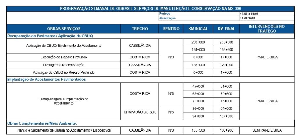 A Way-306, divulga todas as semanas a programação de obras e intervenções que serão realizadas ao longo de seus trechos concedidos. O objetivo é garantir transparência, segurança, conforto e acesso à informação para os lindeiros, usuários e comunidades lindeiras. Durante o período das intervenções, alguns trechos poderão sofrer interdições parciais para execução de serviços de […]